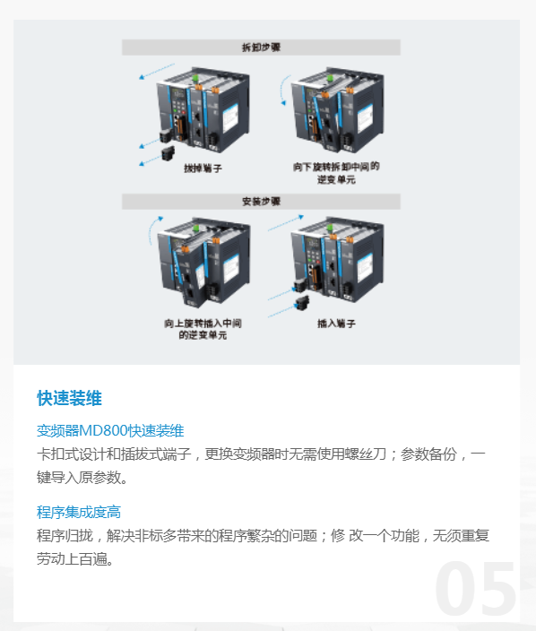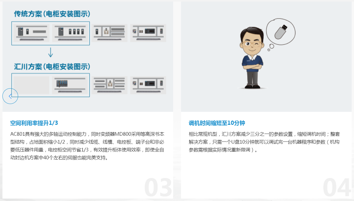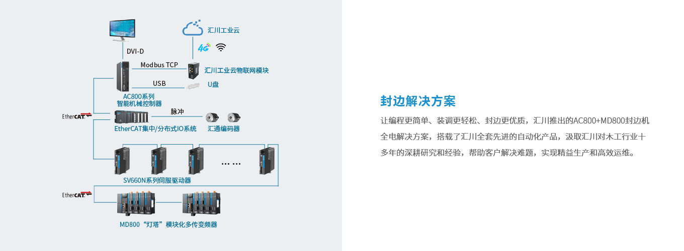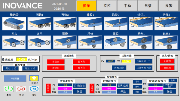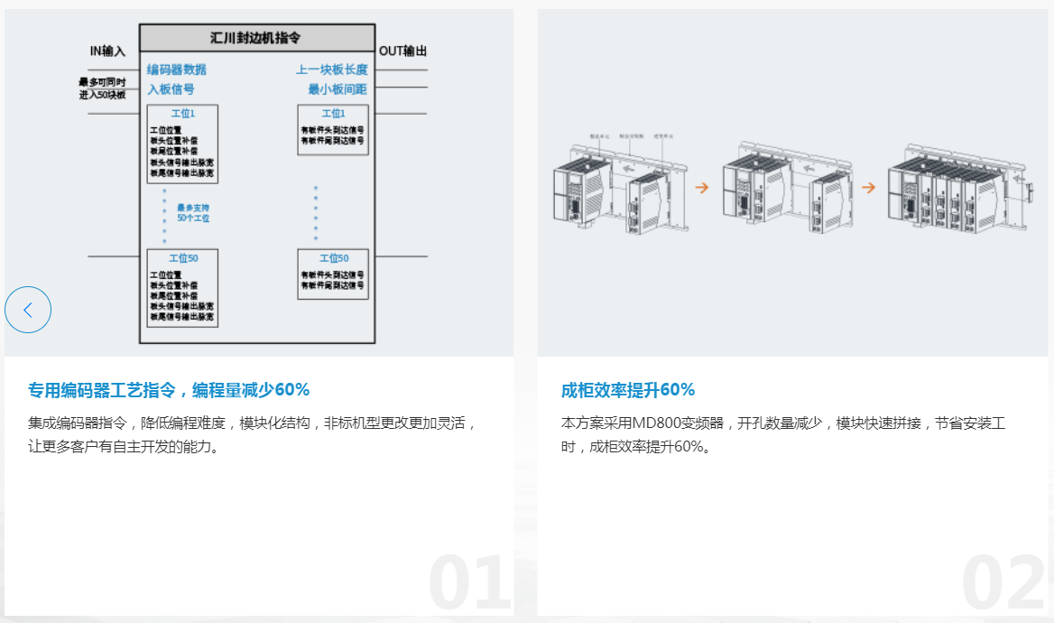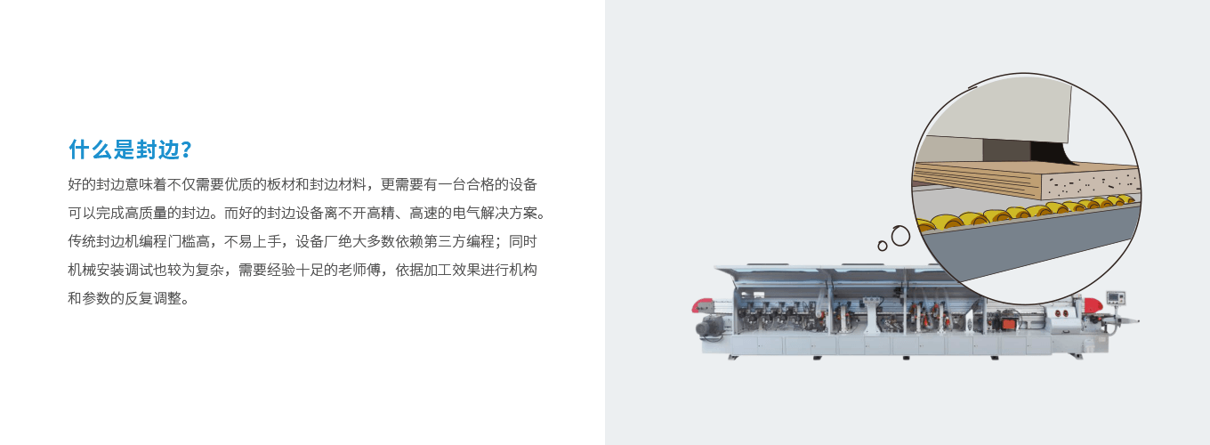 傳統(tǒng)封邊機(jī)采用低中高三檔調(diào)速,匯川方案只需設(shè)置兩檔即可實現(xiàn)范圍內(nèi)的任意調(diào)速,不僅參數(shù)設(shè)置大大減少,同時提升自動化效率,降低連線設(shè)備前后端速度差導(dǎo)致的板材不良率。